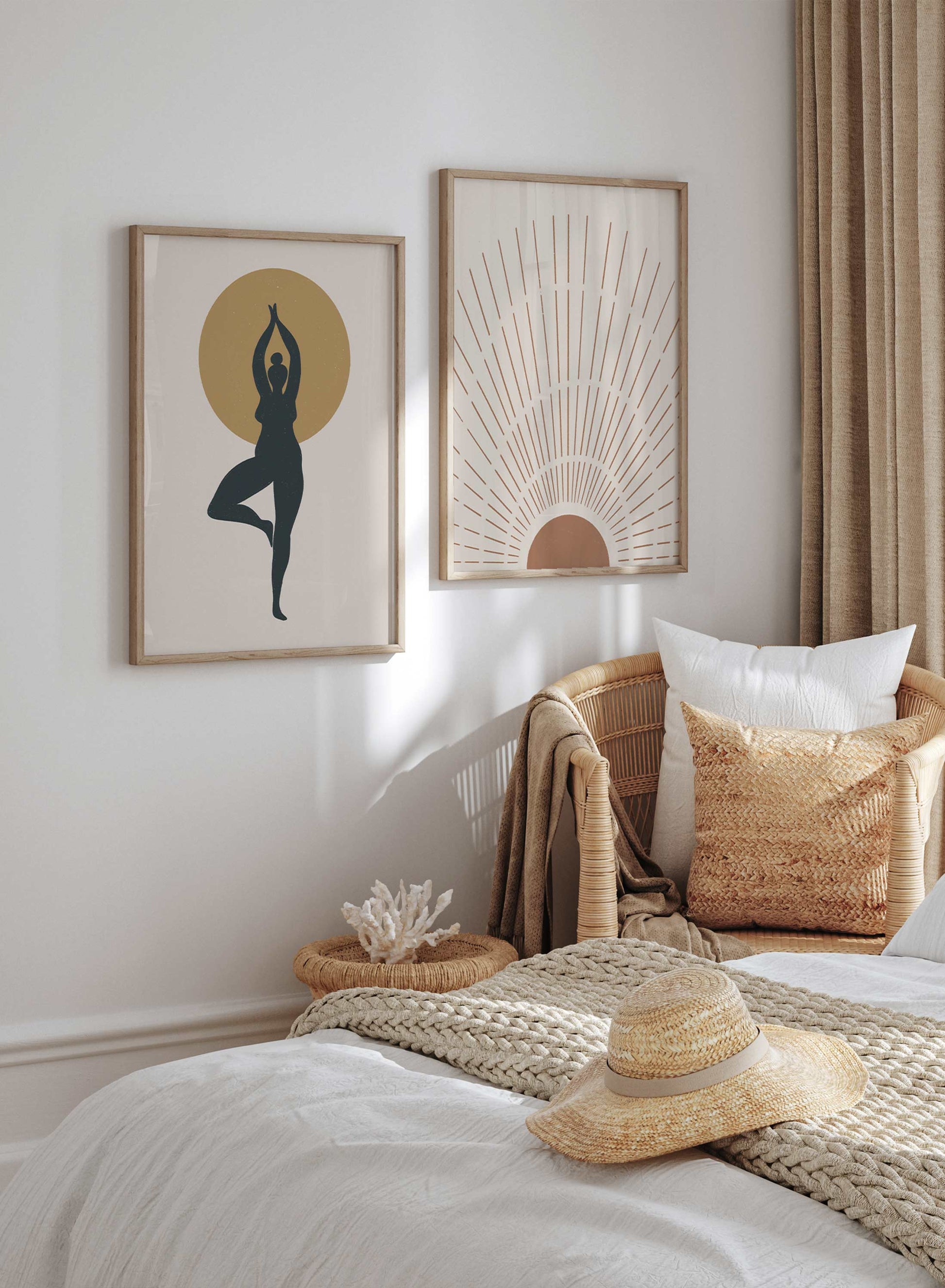 Nothing like the ‘Tree Pose’ or Vrikshasana to find some balance and stability! This poster deserves its spot on every yogi’s wall. This boho art print features a woman’s silhouette standing in the tree pose over a mustard-yellow sun and a soothing beige background.